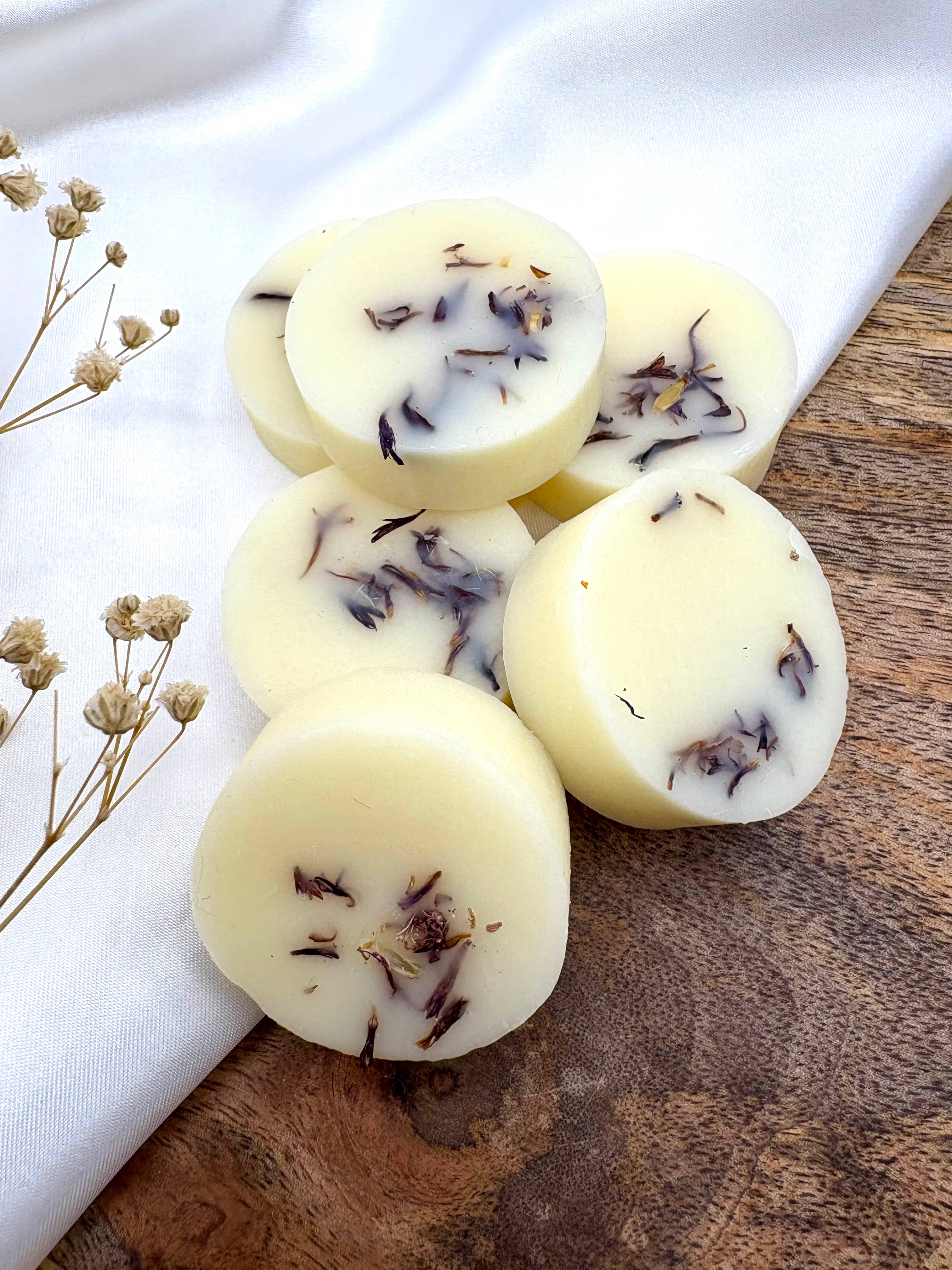 This warm and cosy fragrance will take you on a magical spice-infused journey, the smell of oranges and spices permeating the air while a warming fire crackles in the corner. Each wax melt is delicately decorated with dried botanicals.