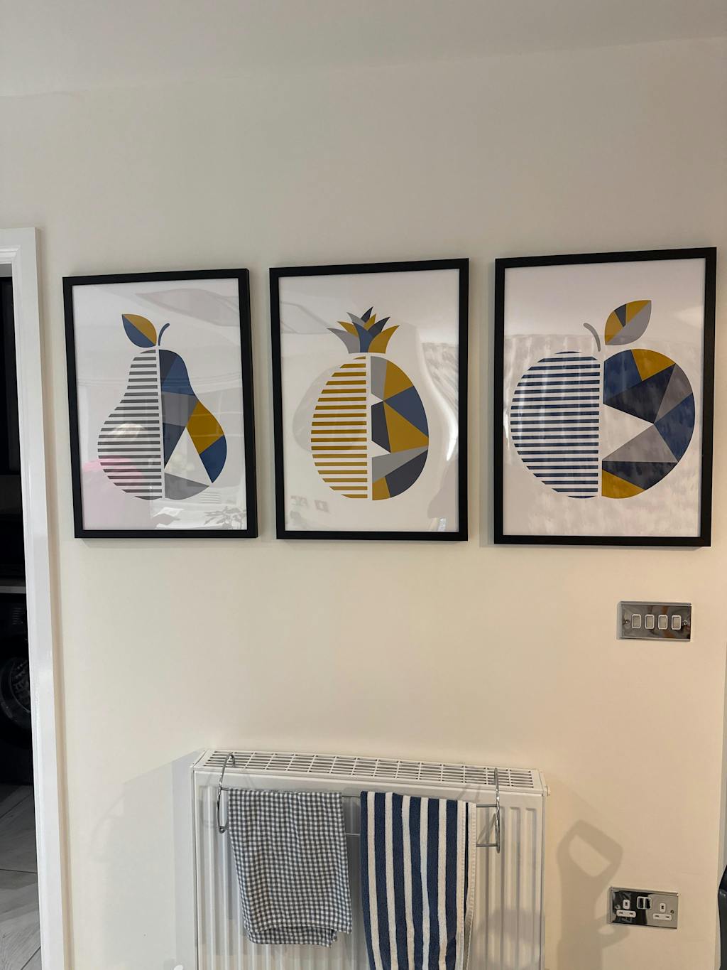 Bring a touch of modern style to your kitchen with our Set of 3 Yellow & Blue Geometric Fruit Kitchen Framed Prints! Featuring vibrant geometric designs of an apple, pear, and pineapple, these framed prints will add a pop of colour to your walls. Perfect for fruit lovers and those who appreciate contemporary art.