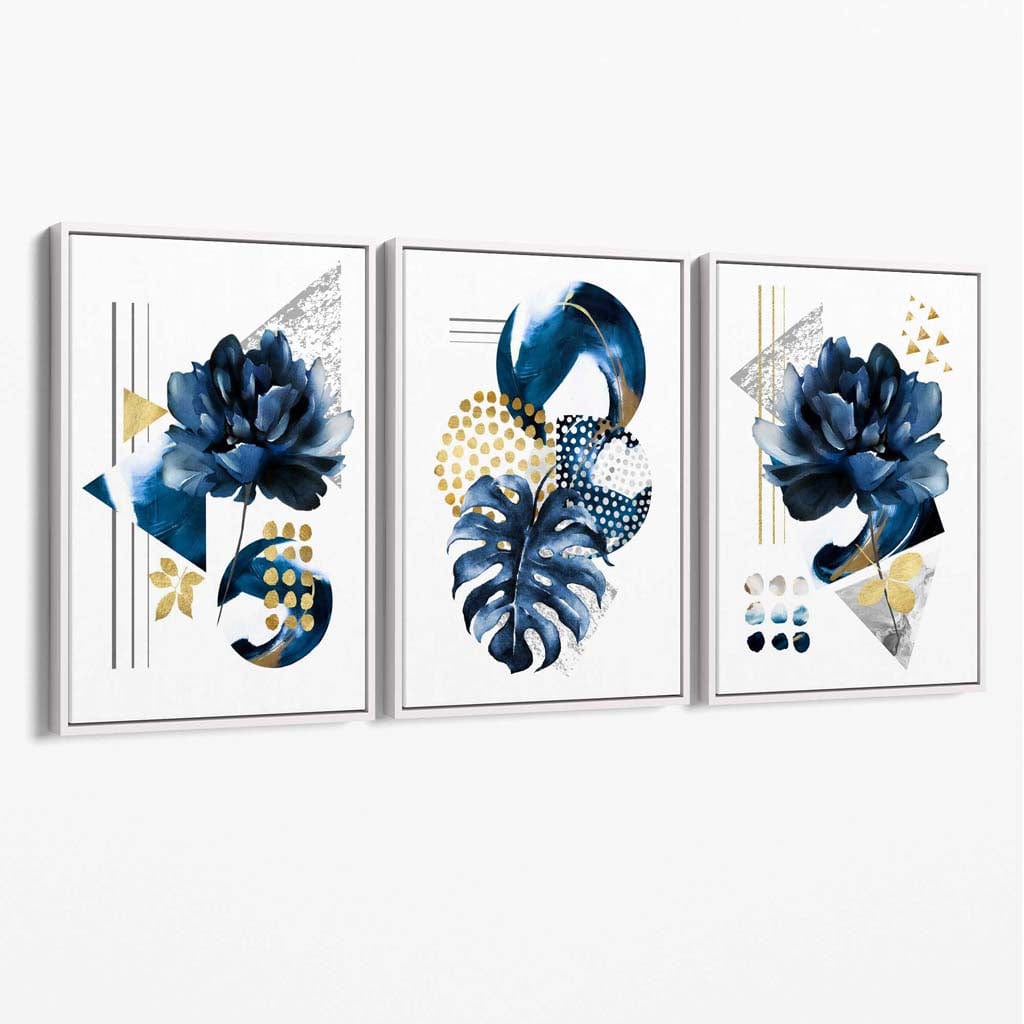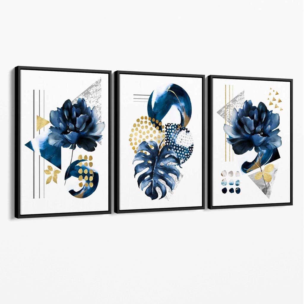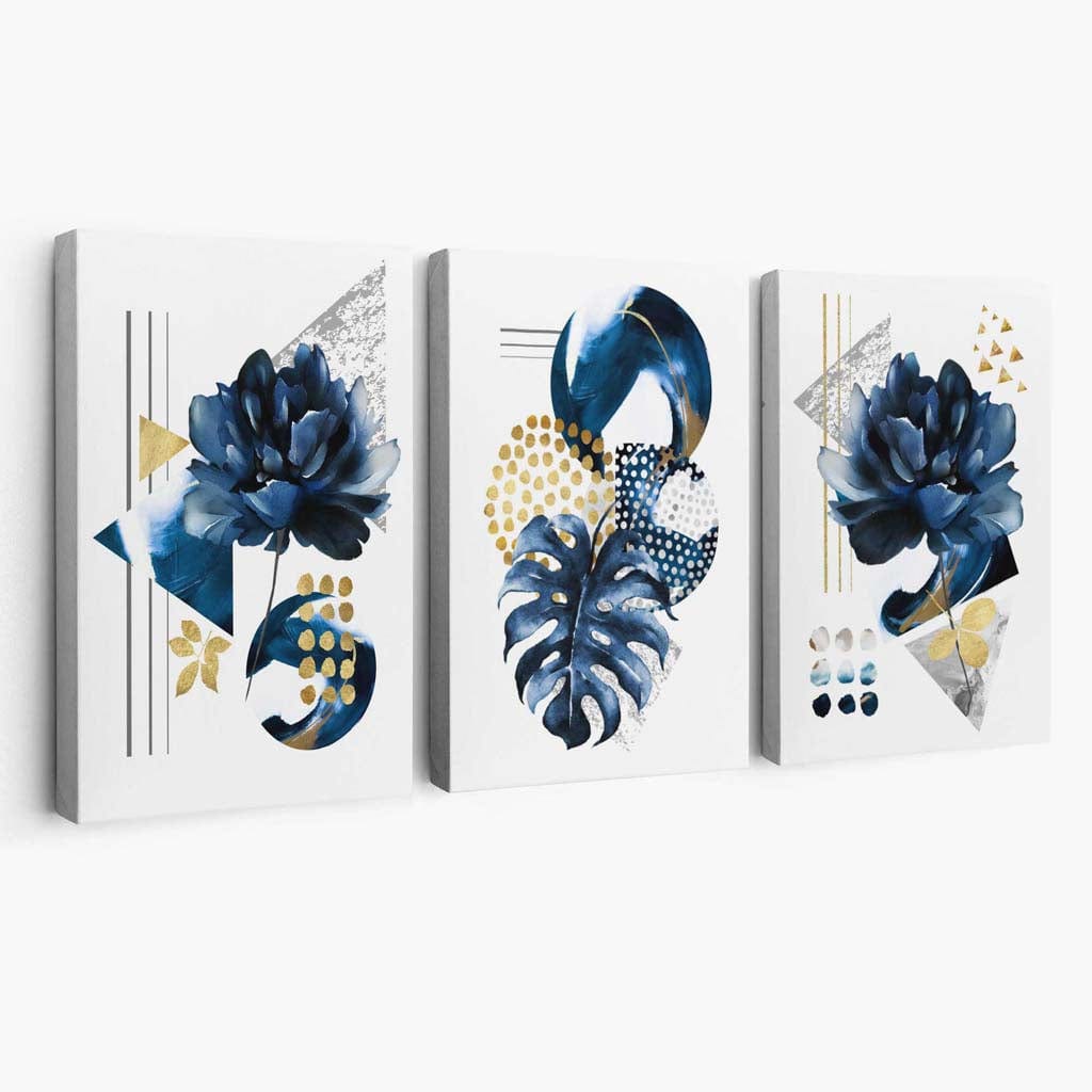 Abstract Navy Blue and Gold Set of 3 Floral Canvas Wall Art