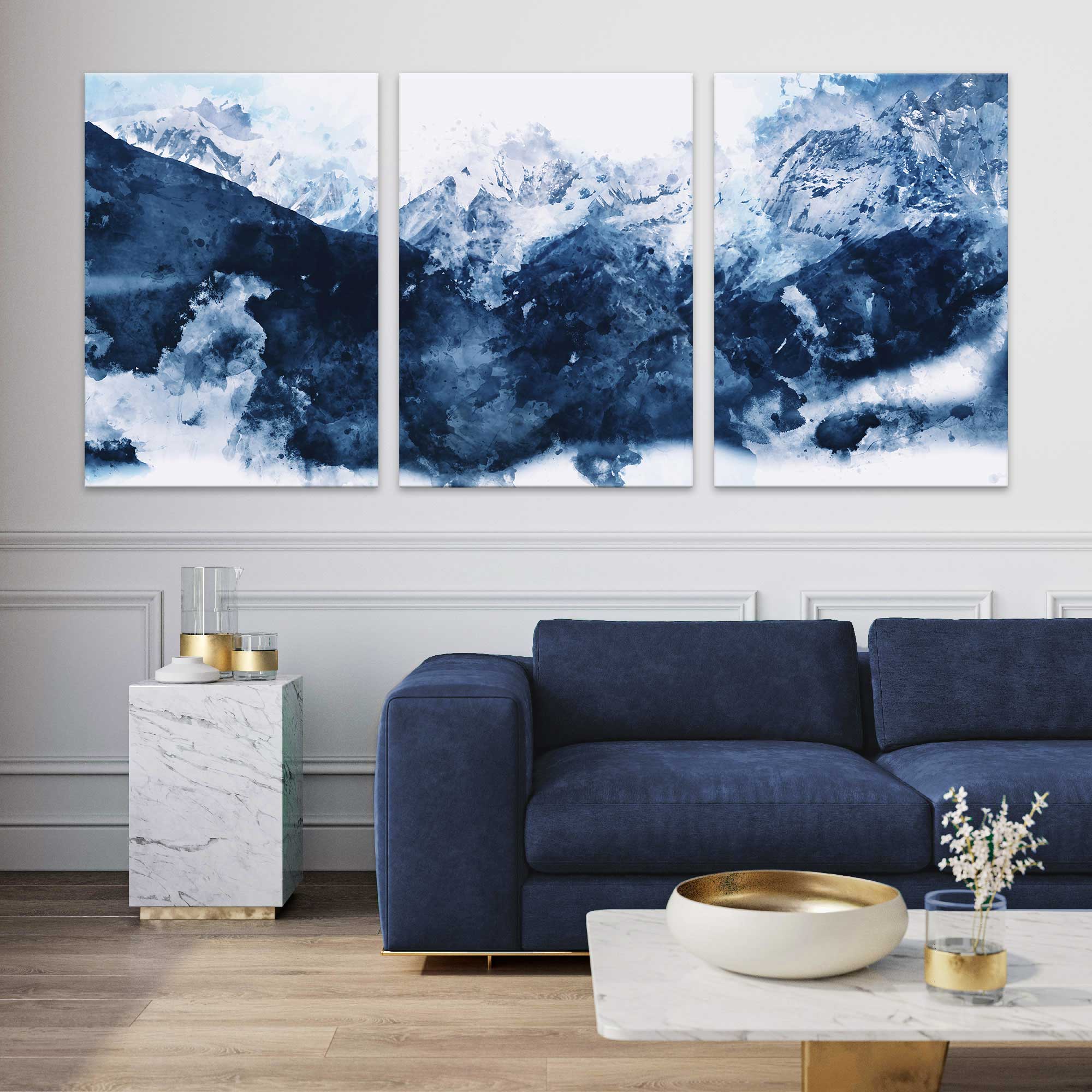 Enhance your home decor with our Abstract Navy Blue Mountains Set of 3 Canvas Art Prints. These stunning pieces feature a unique abstract design of navy blue mountains, adding a touch of sophistication to any space. Made with high-quality canvas, these prints are sure to elevate the aesthetic of your home.