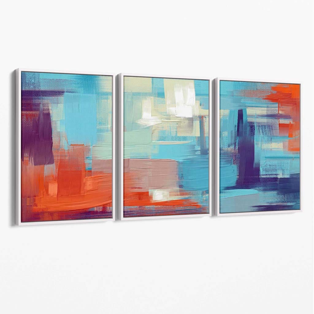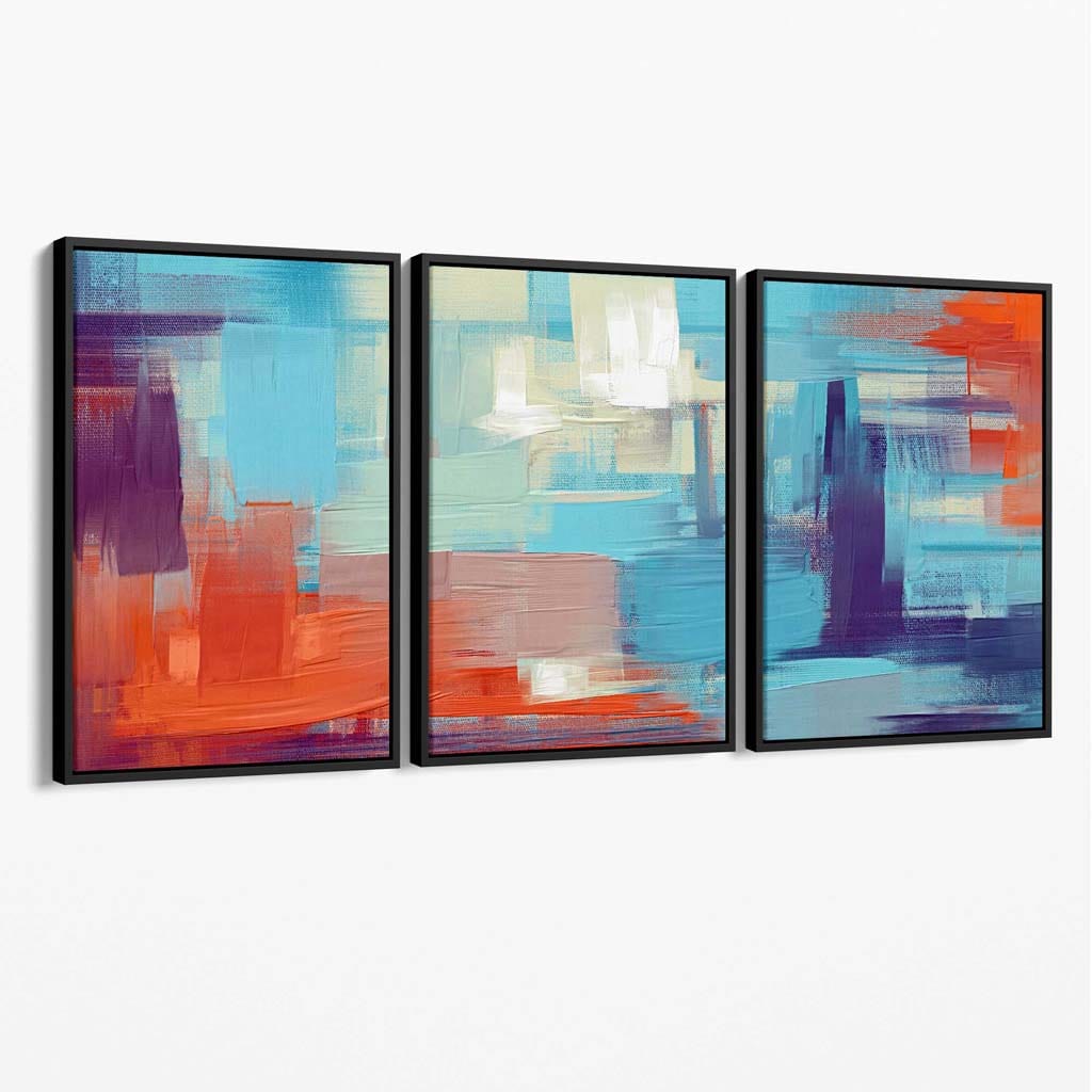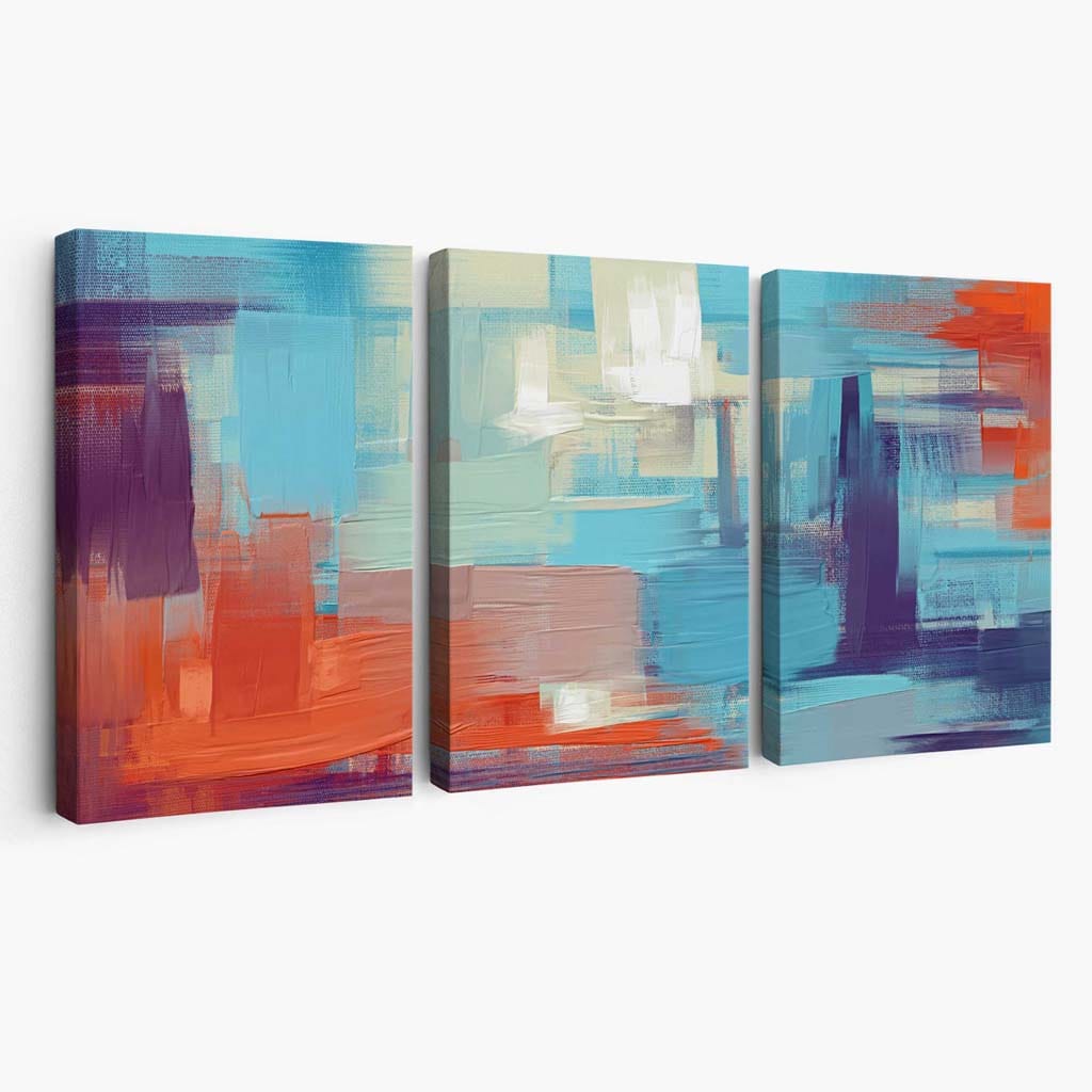 This 3-panel "Sunset Plaza" canvas wall art set from our Abstract Triptych Collection adds a dash of deep purple, vibrant blue, and glowing orange hues to any Boho, Modern, or Minimalist interior. Make a powerful statement with this bold, oil painting-style art print.