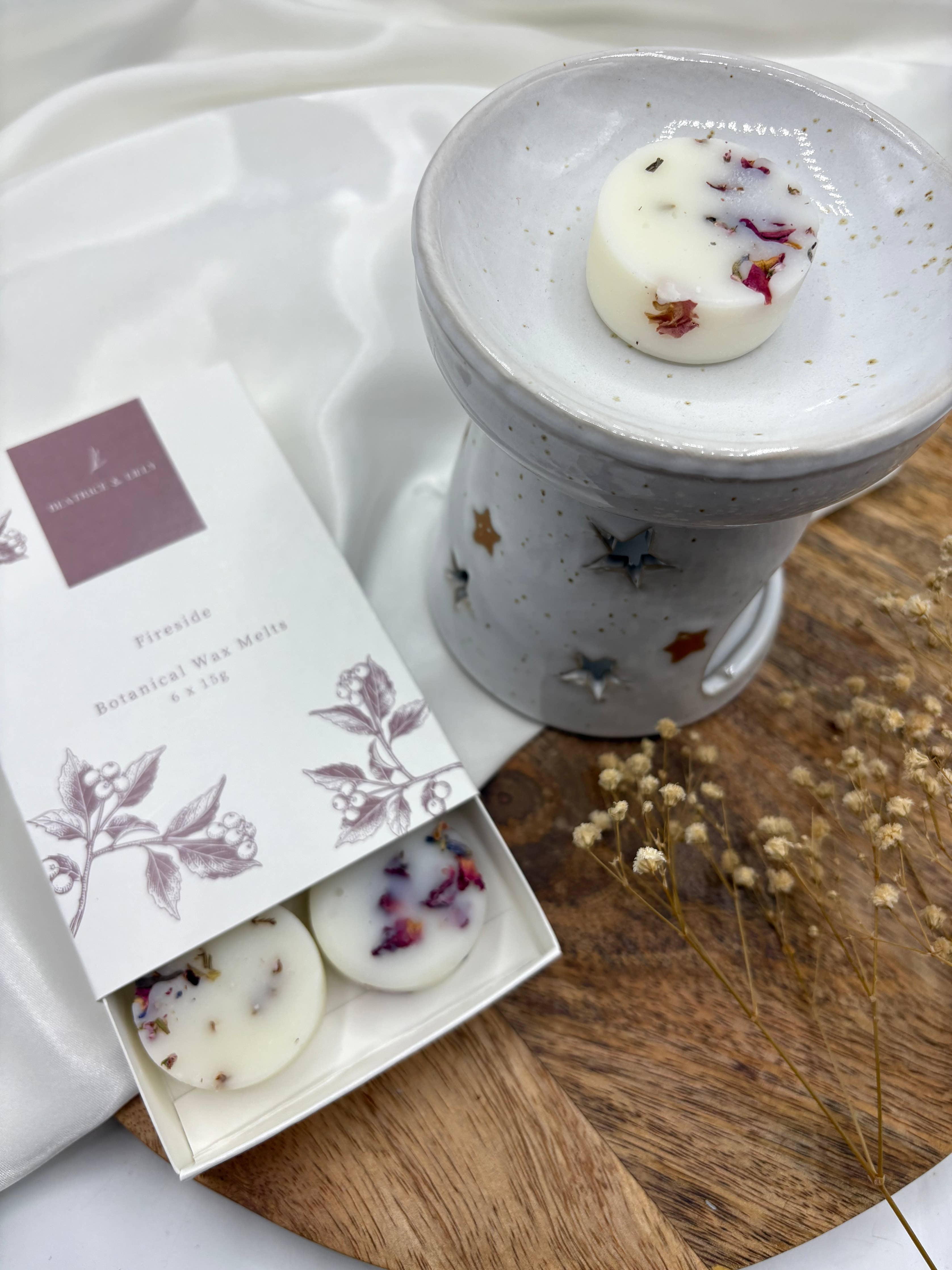 Step out of the cold and warm yourself up with our fabulous Fireside scented botanical wax melts! Crisp bergamot is warmed by floral spice on a comforting base of woods, creating the ultimate cosy fragrance. This fragrance is part of our Autumn/Winter collection. Our luxury match style boxes come nestled with 6 round shaped botanical wax melts. Each wax melt is perfectly handcrafted within our studio using natural coconut wax, high quality and long lasting fragrance oils and delicately decorated with dried botanicals. Perfect for gifting or a beautiful treat for yourself.