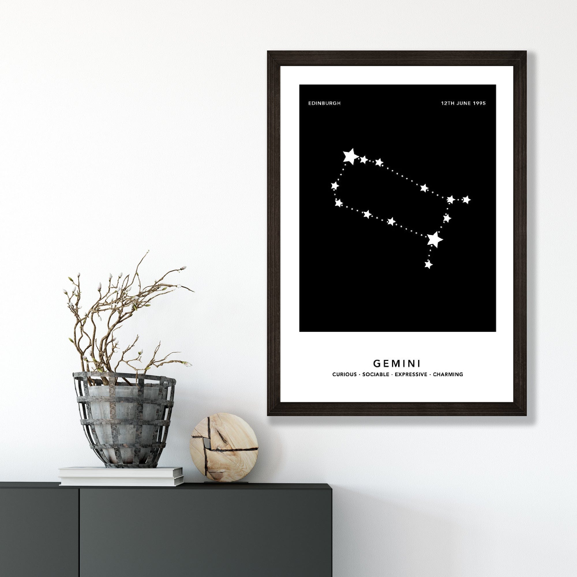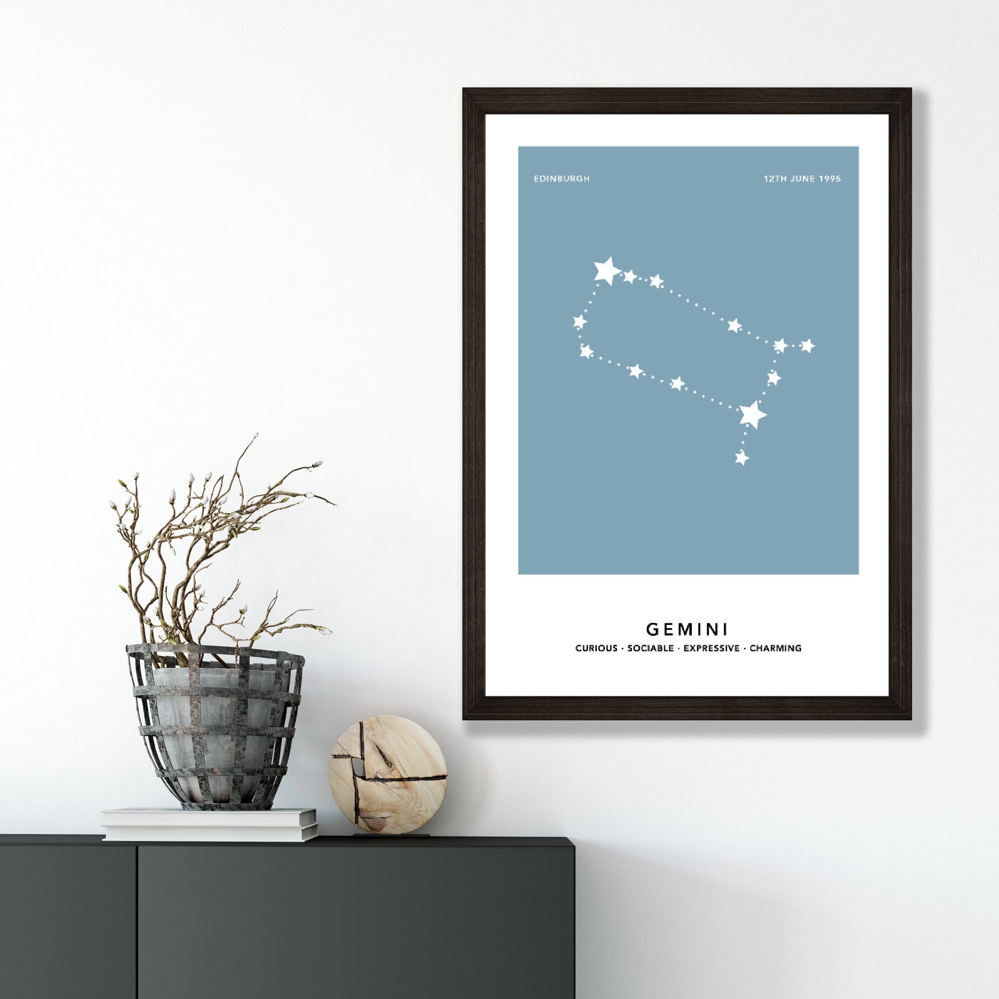 Bring the starry night into your home with a one-of-a-kind, personalized Gemini constellation art print! Perfectly capturing your zodiac sign, this stunning piece adds a celestial atmosphere to any interior space.