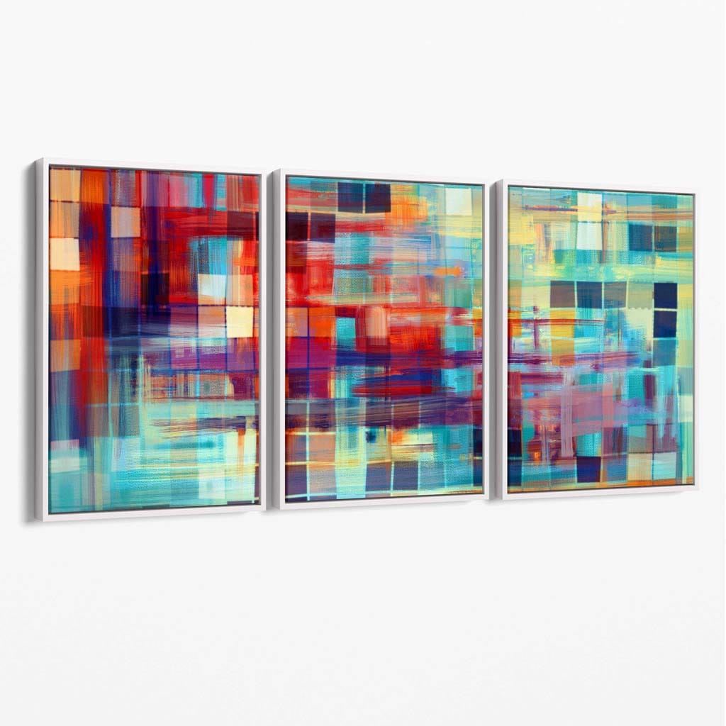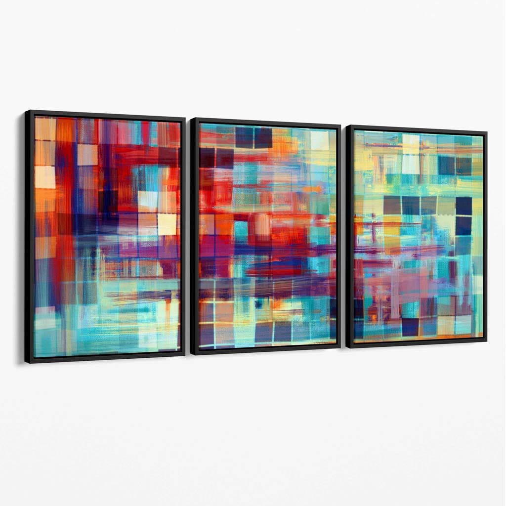 A vibrant addition to our Abstract Triptych Collection, these 3 Canvas Prints showcase an abstract squares pattern in Red, Blue, Orange, and Green. Perfectly fitting Boho, Modern, and Minimalist homes, this Wall Art is sure to create a stunning impression!