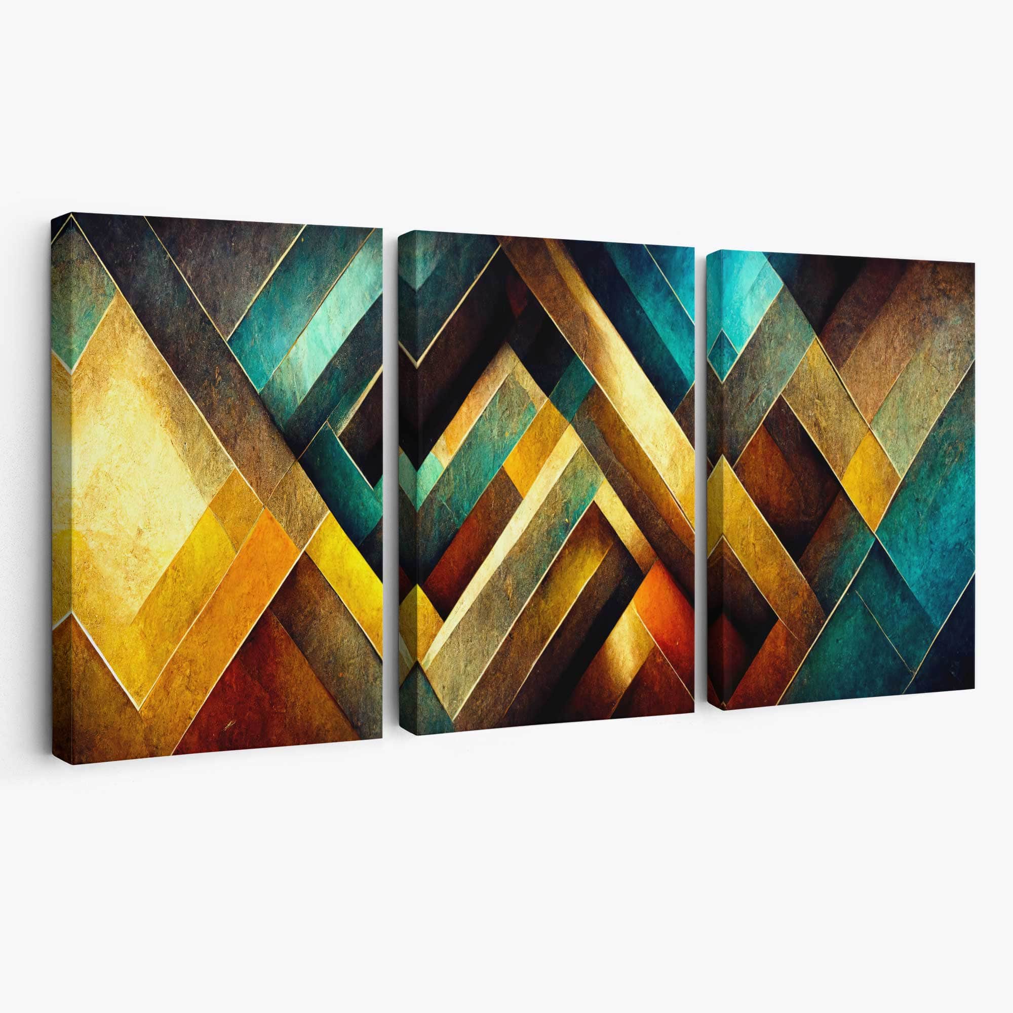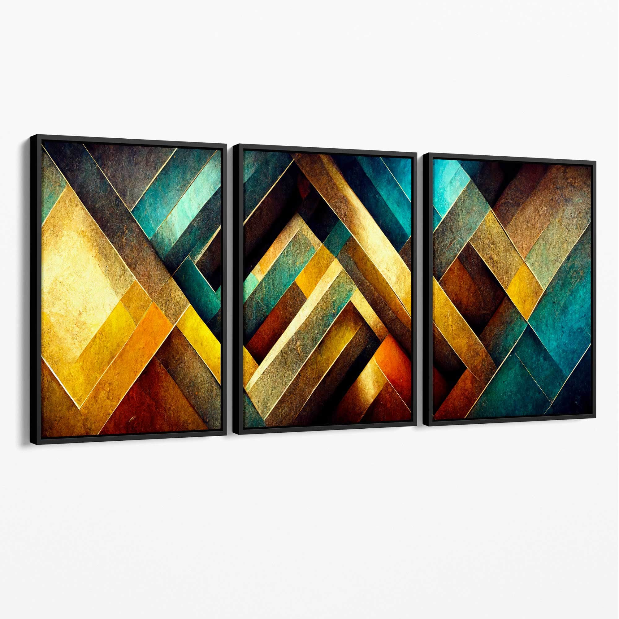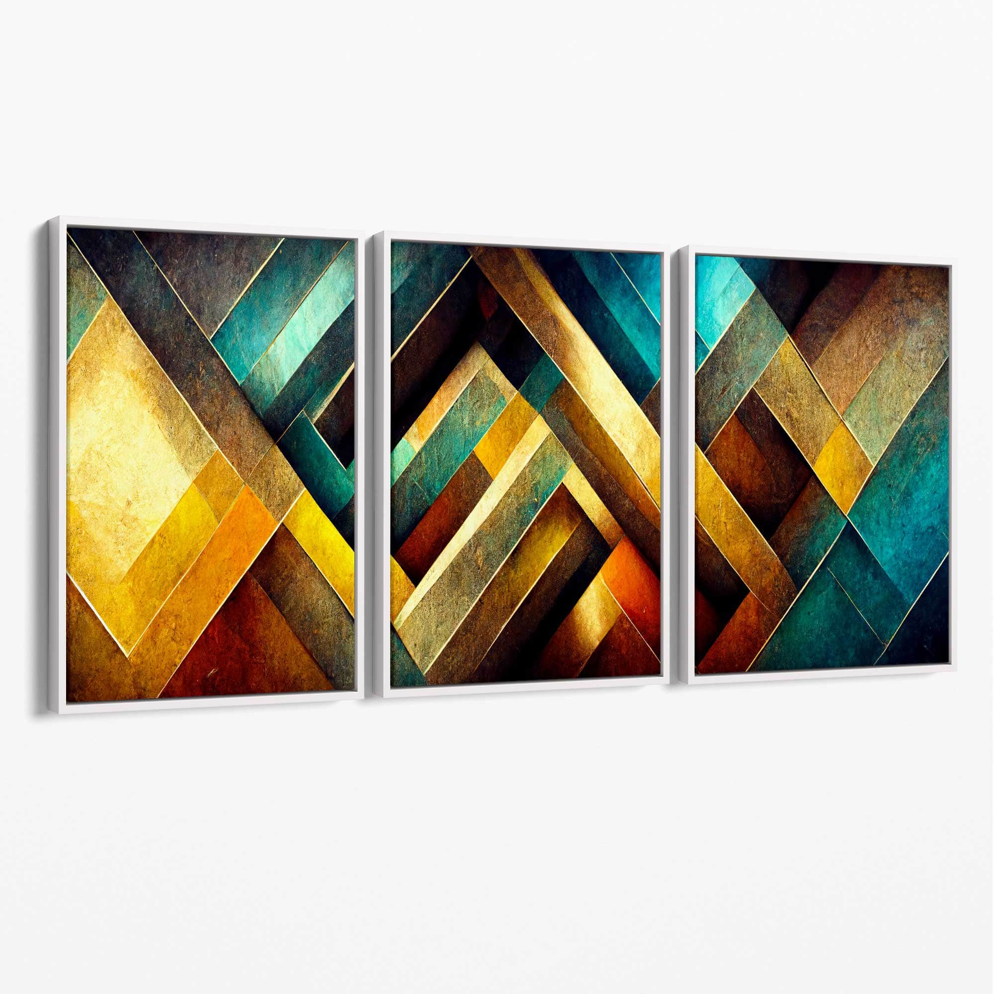 Part of our Abstract Triptych Collection, this Set of 3 Wall Art prints feature three panels from an original mixed media work featuring distressed herringbone tiles in shades of Aqua Blue, Yellow Orange and Red.