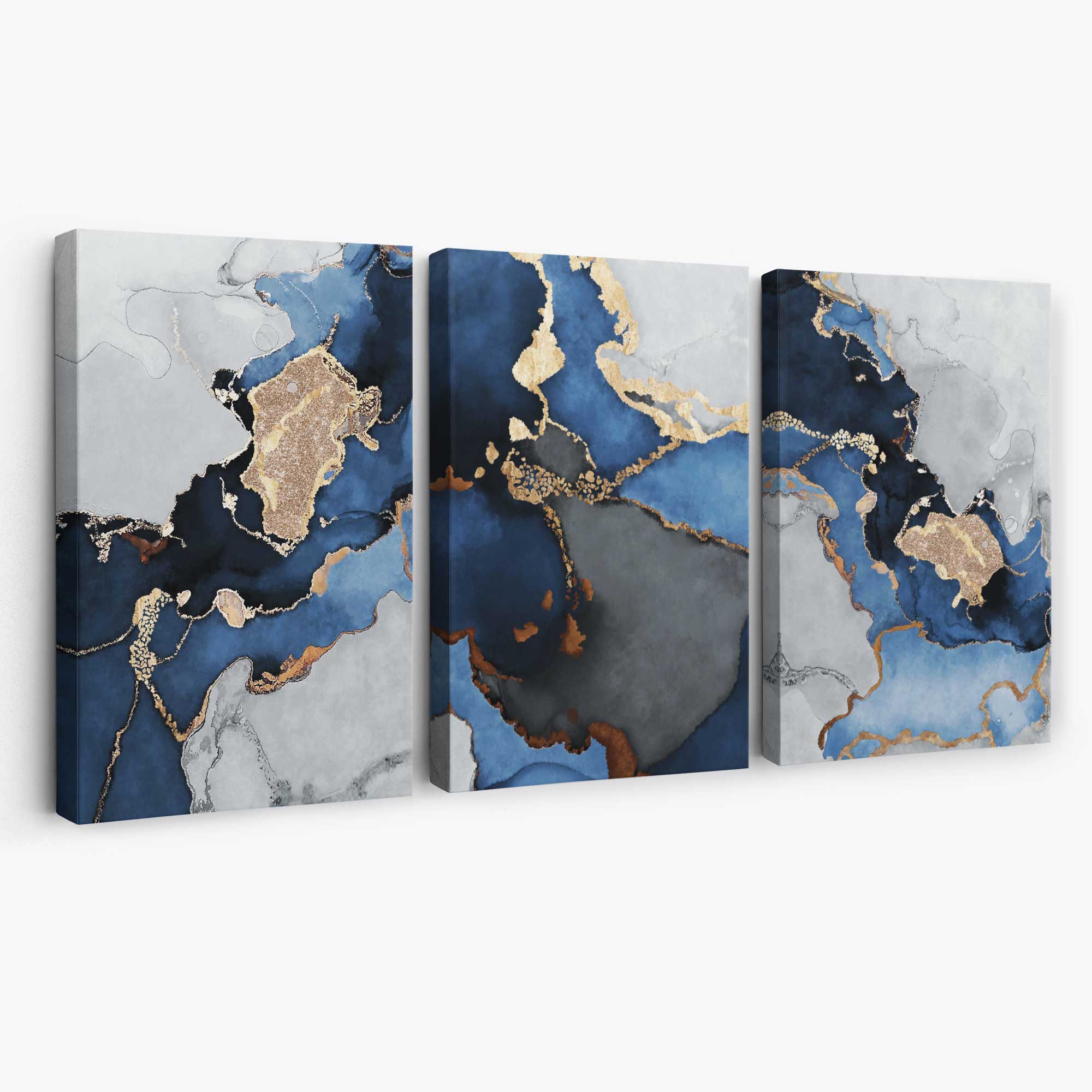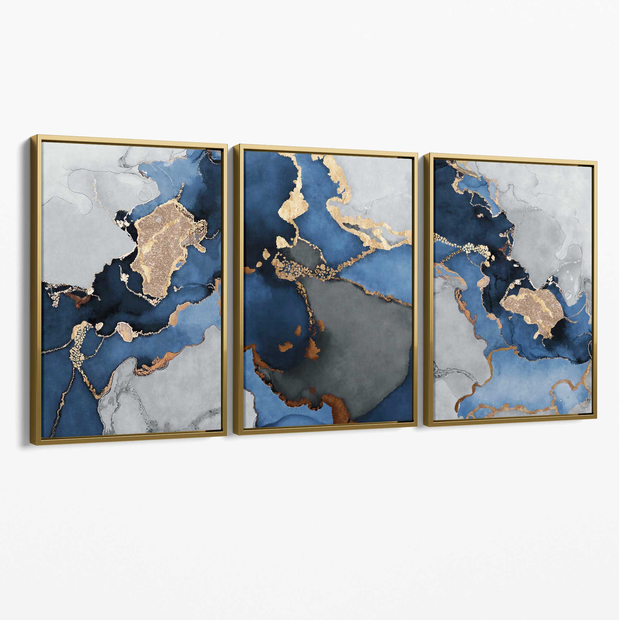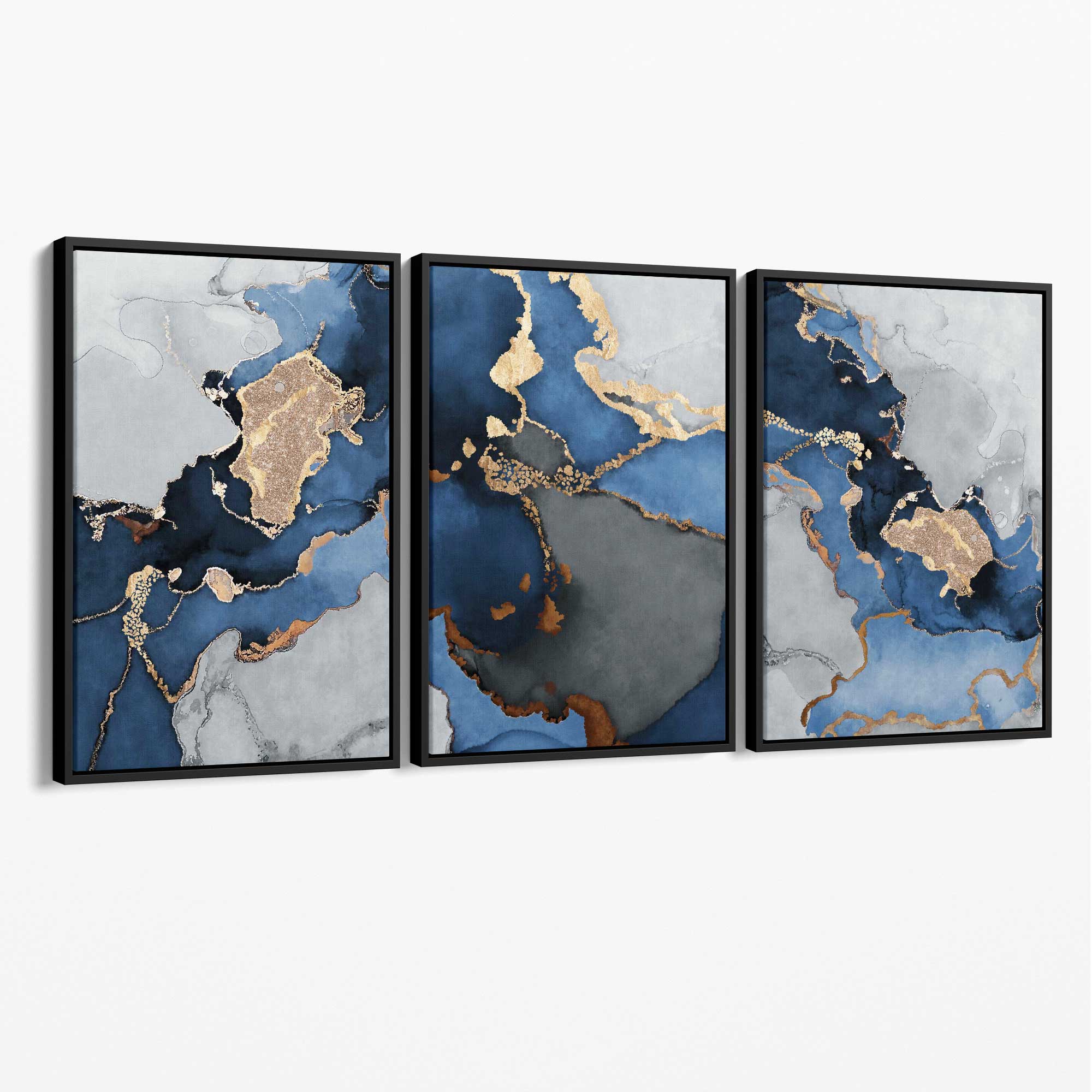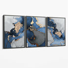Set of 3 Abstract Marble Navy Blue, Grey and Gold Canvas Art Prints