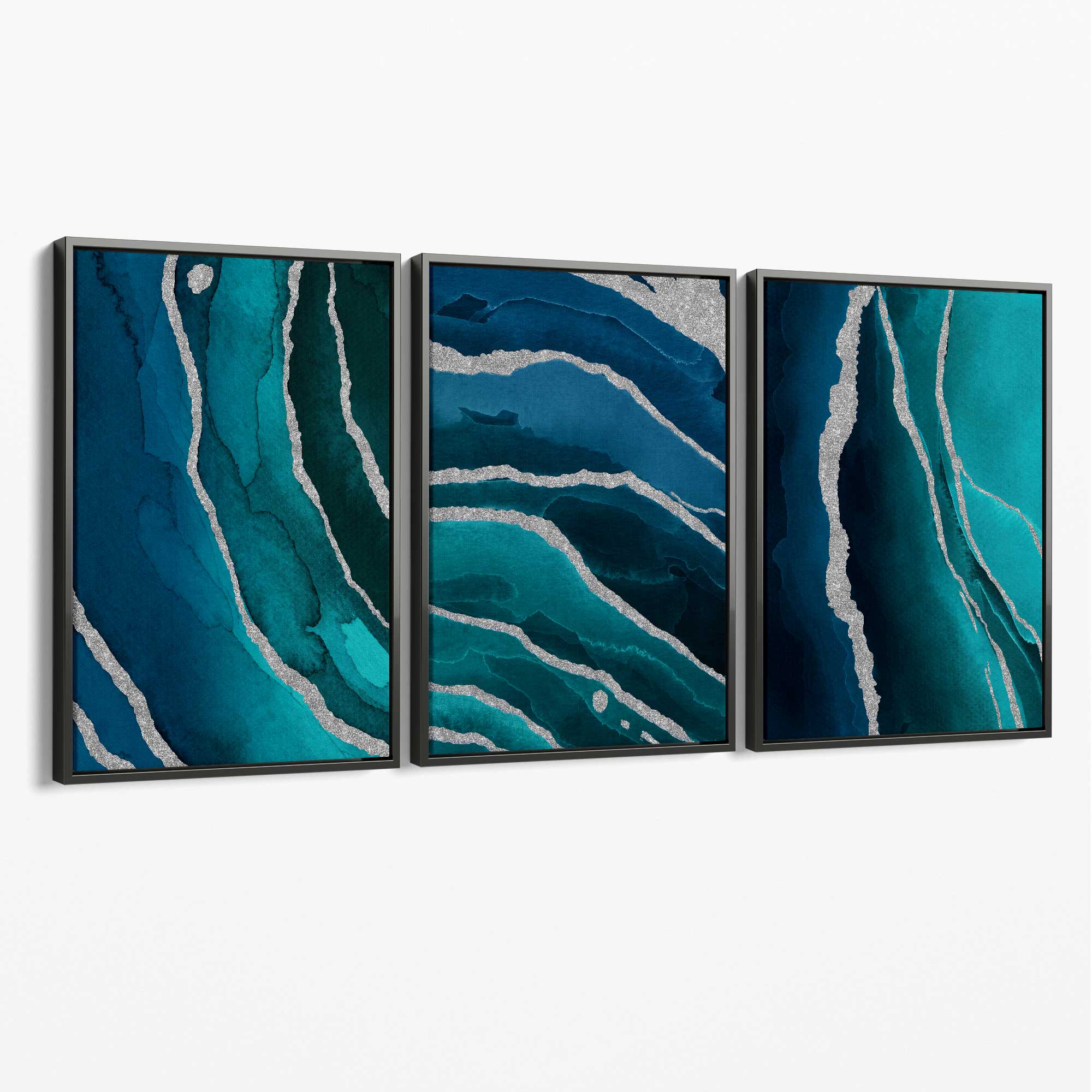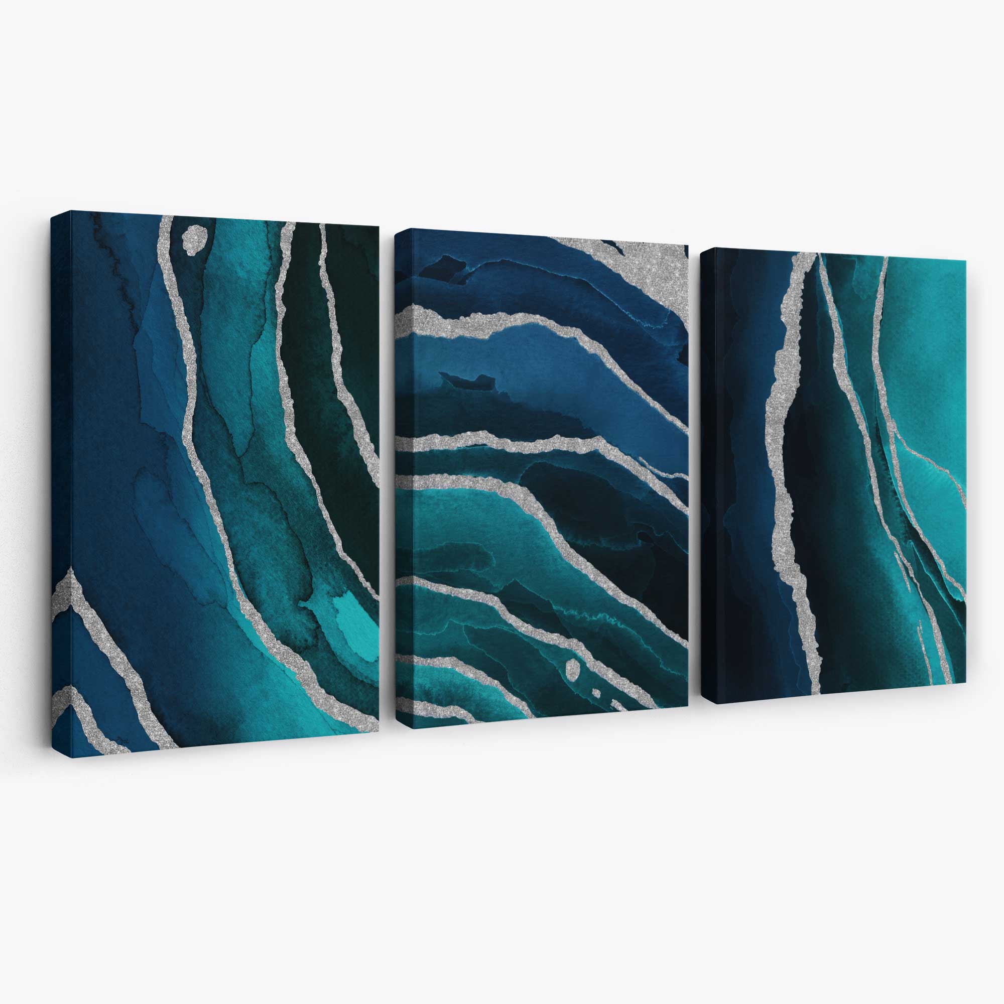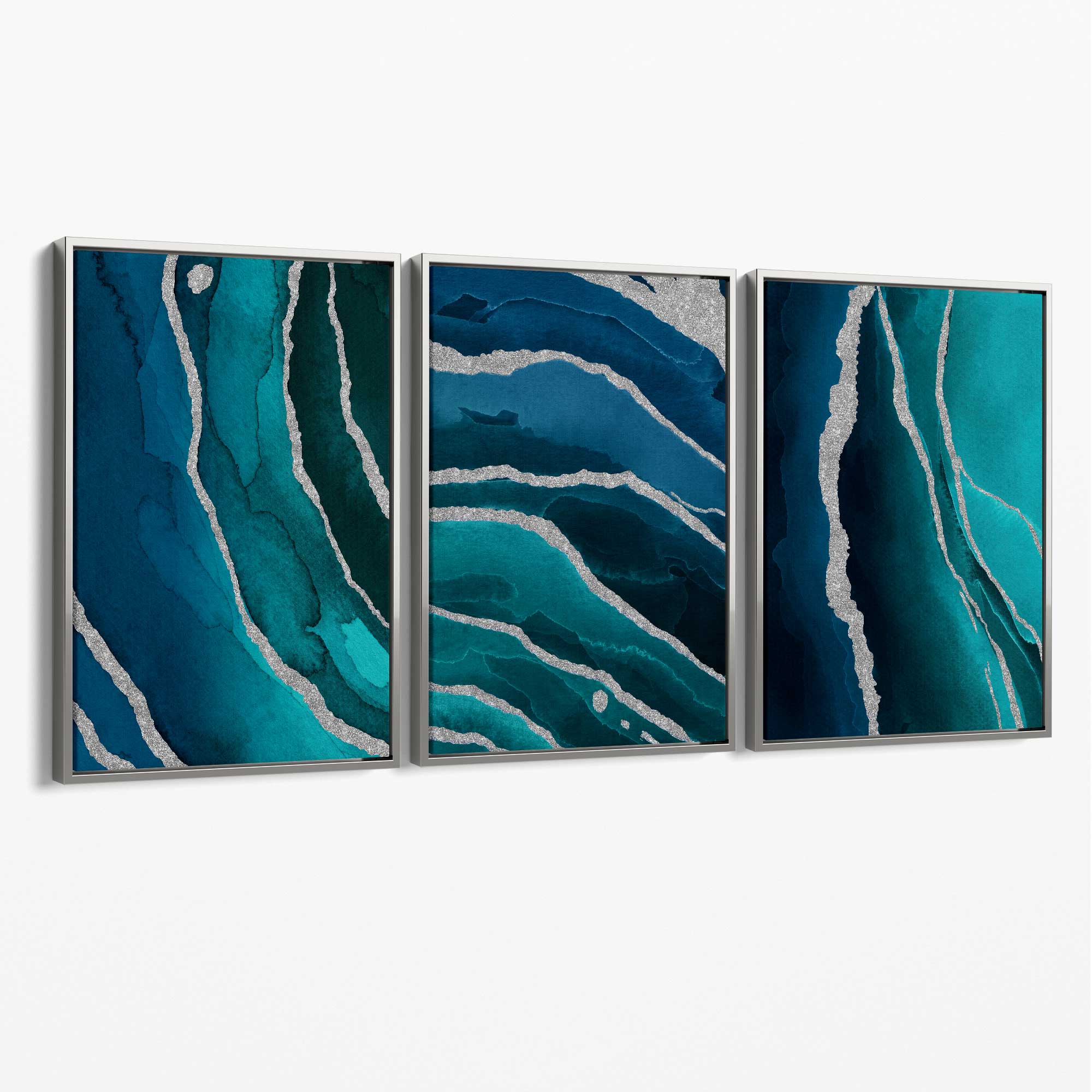Set of 3 Teal, Navy Blue and Silver Canvas Art Prints