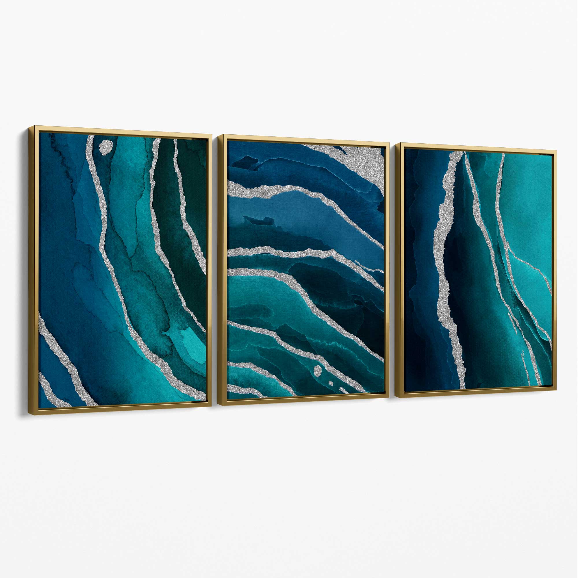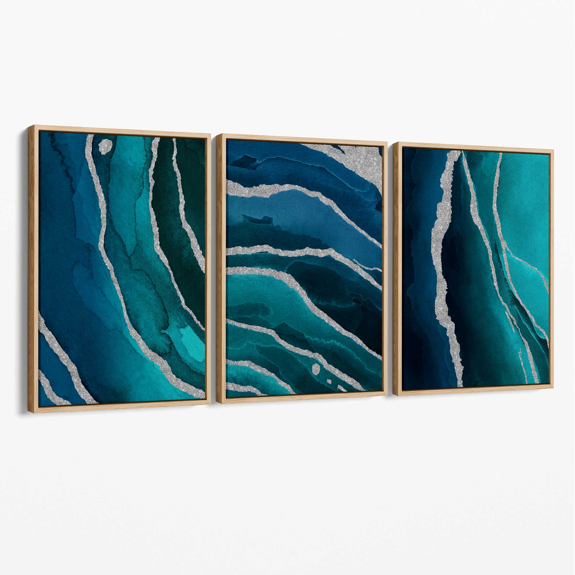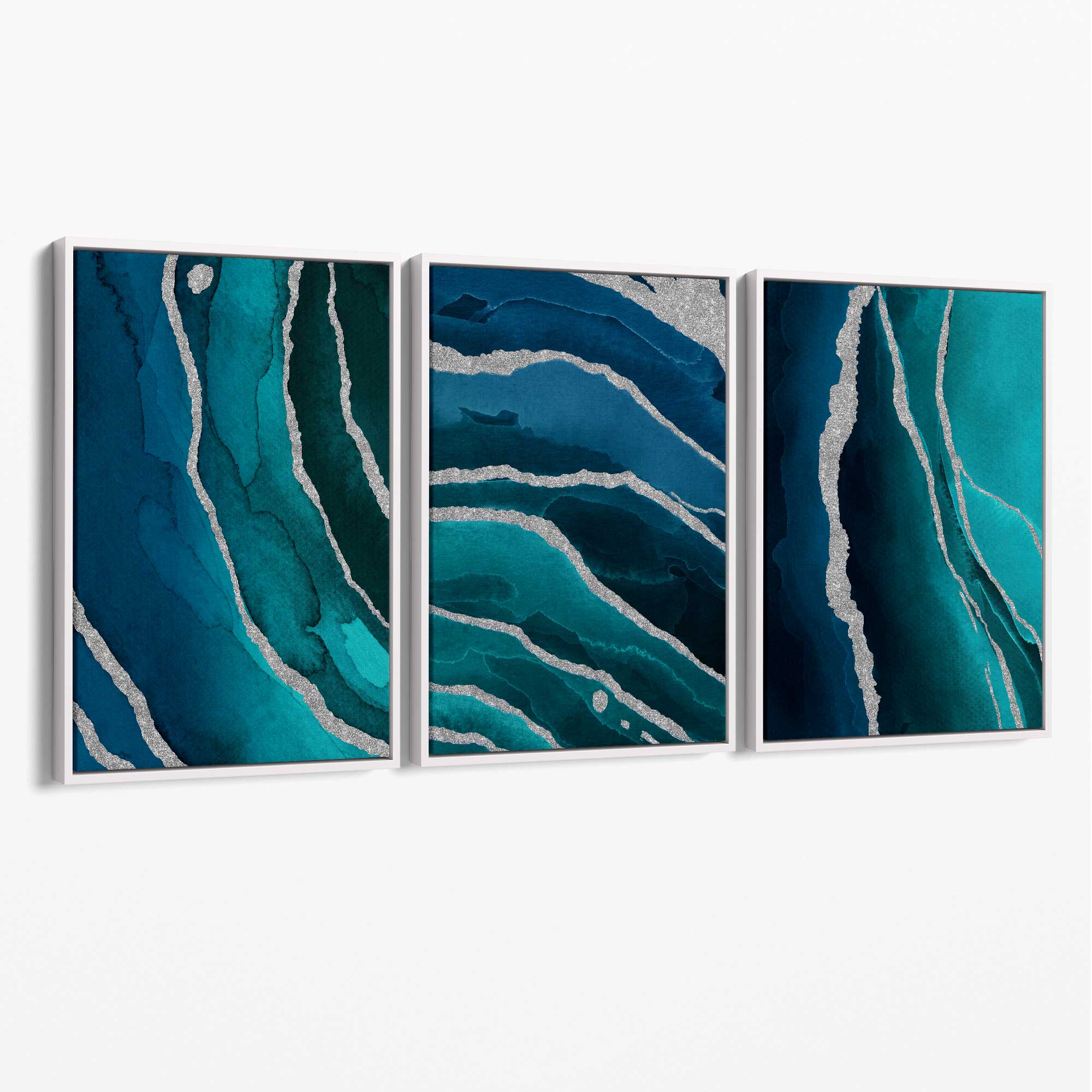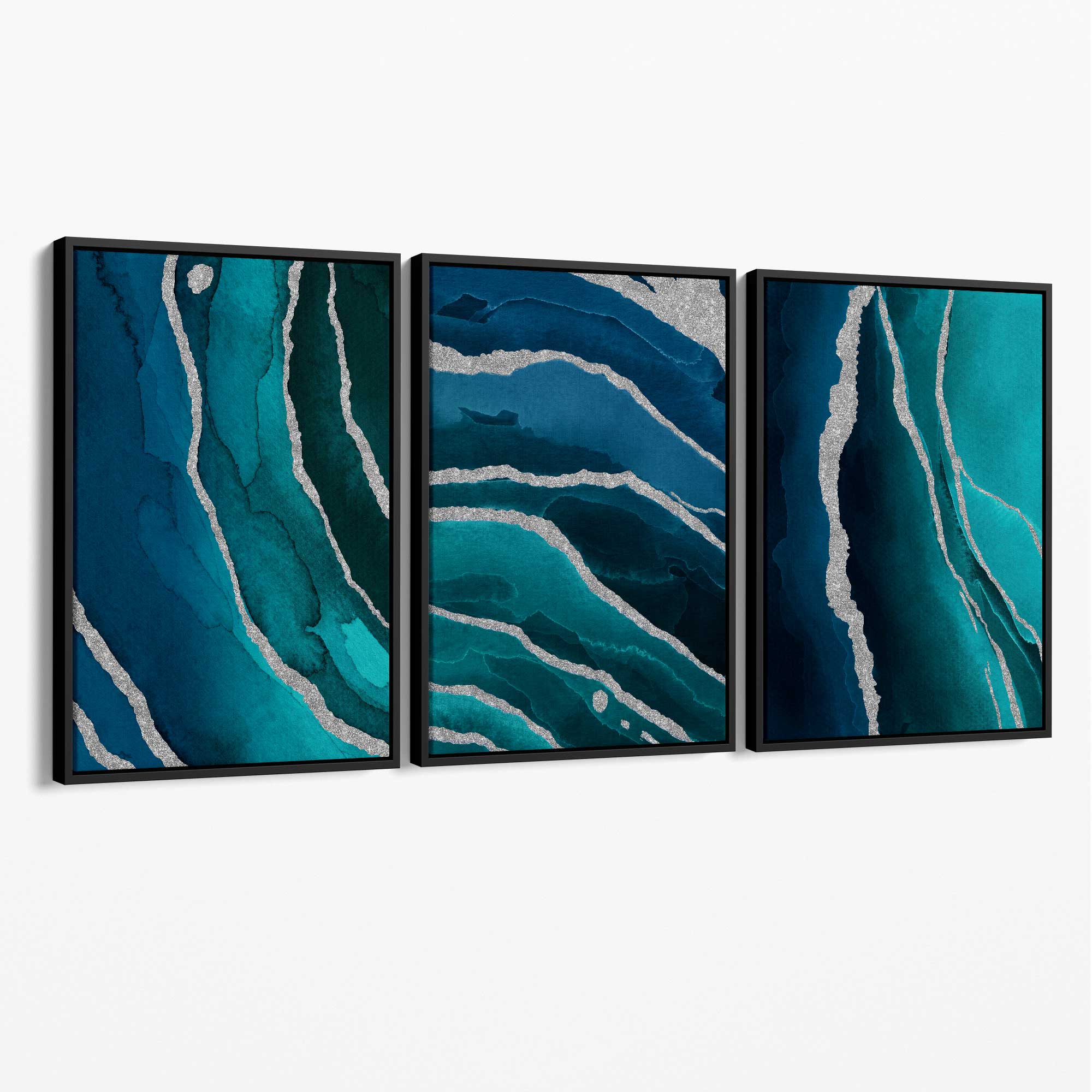 Set of 3 Teal, Navy Blue and Silver Canvas Art Prints